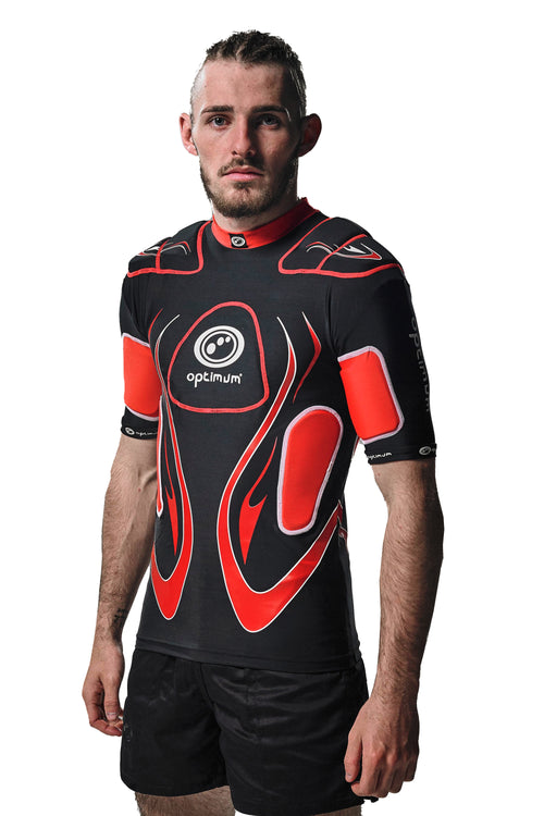 Offering superior protection and comfort during rugby game play and training, the Inferno Protective Top features an extra long length body and Lycra stretch fabric. The strategically placed EVA padding on the shoulders, biceps and sternum are removable, making washing easy. Split shoulder pads contour for a better fit without bunching.