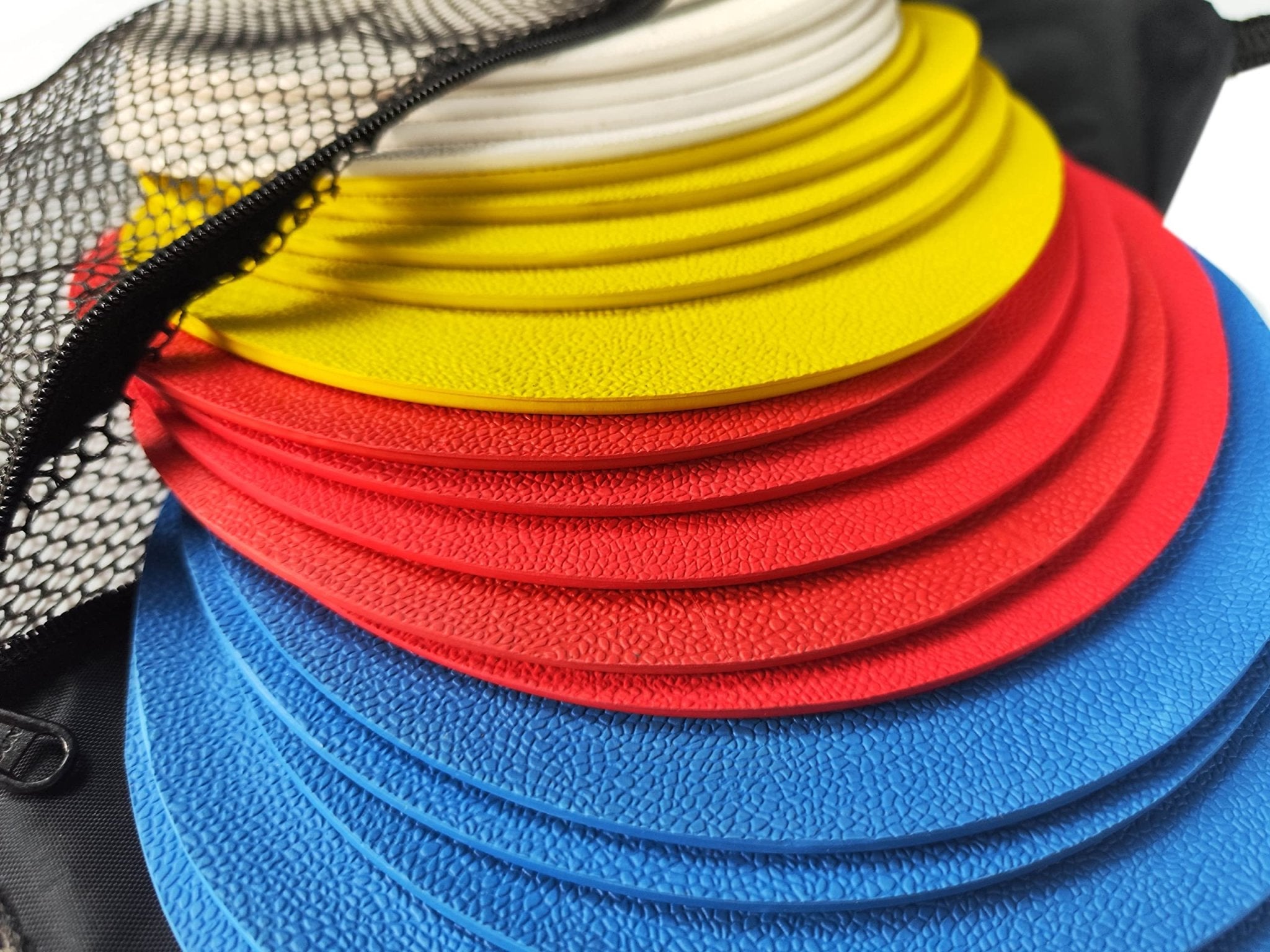 This pack of 20 Optimum flat disc markers are ideal for all training sessions. The heavy-duty non-slip soft PVC markers give the best grip on all playing surface. Each marker is 8" in diameter and brightly coloured in red, white, yellow and blue, making them highly visible for training in all conditions. Each set of markers come packaged in a carry bag for easy storage and transportation.